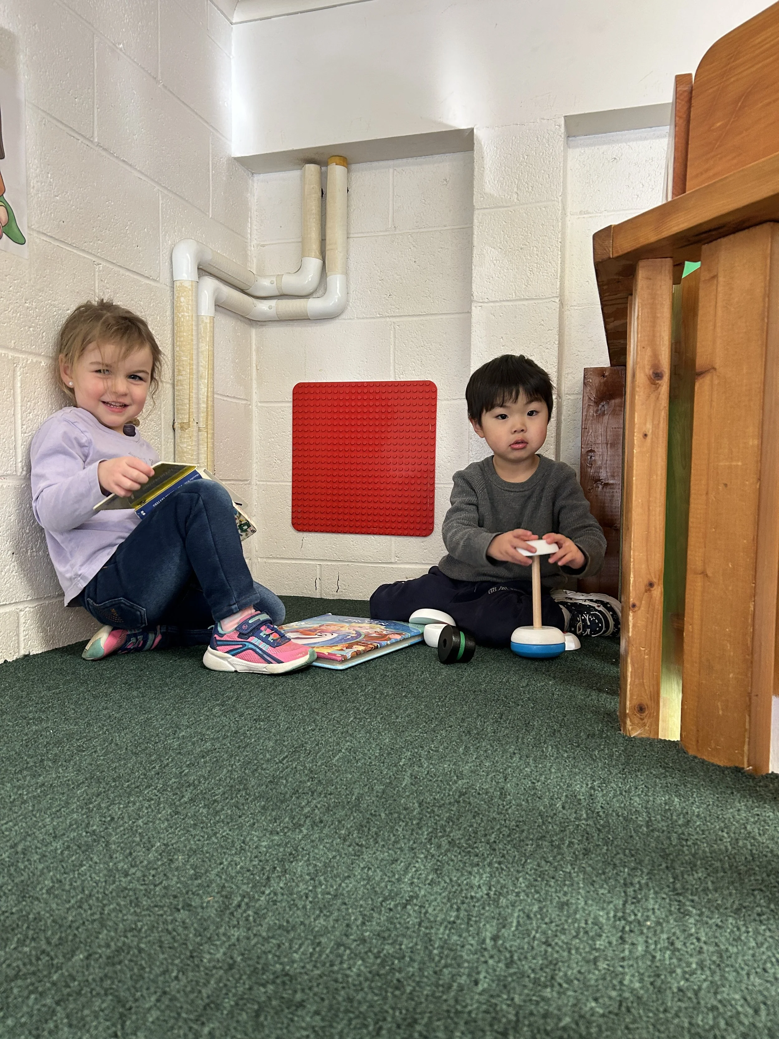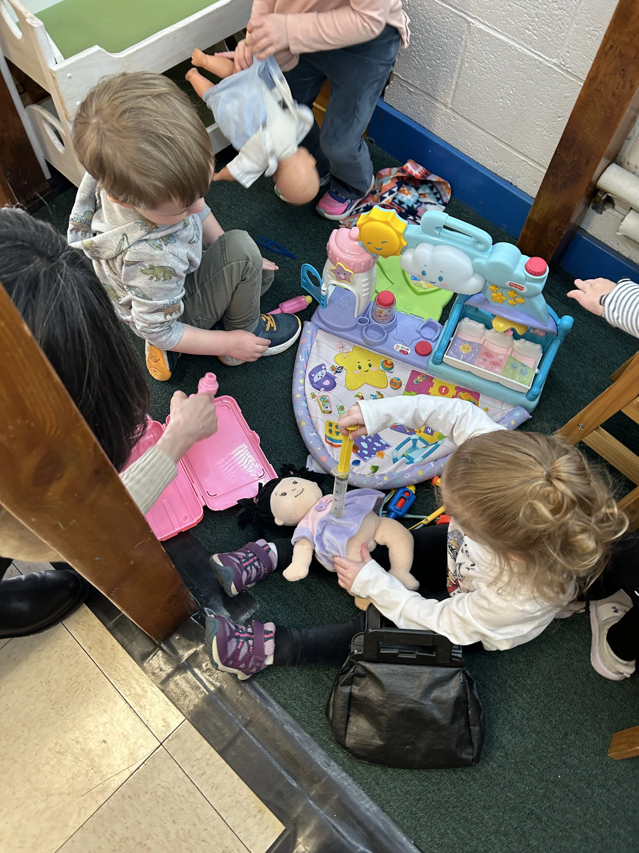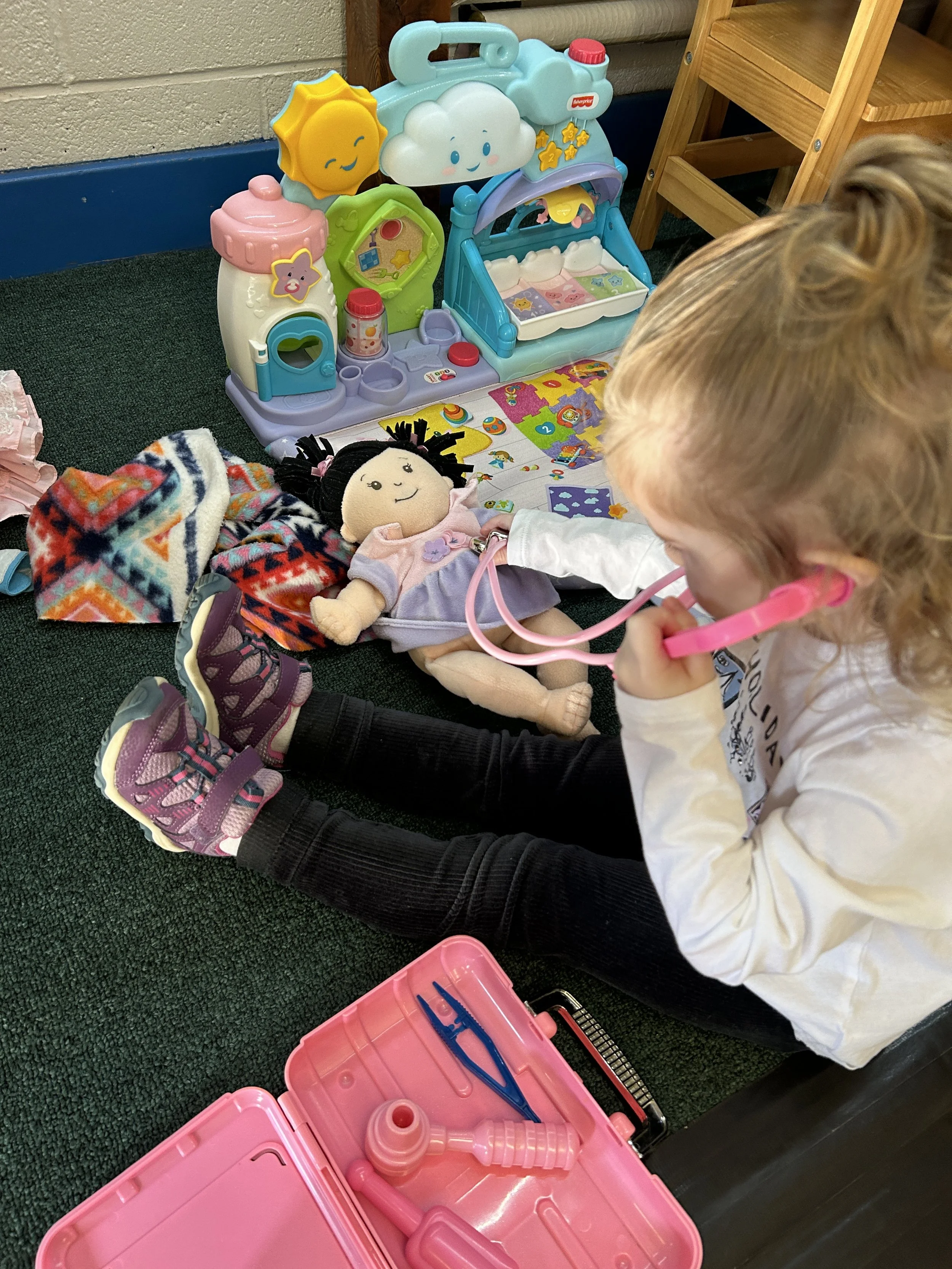 Under the loft, the children engaged in pretend play giving doctor check ups to our baby dolls and putting them to bed.