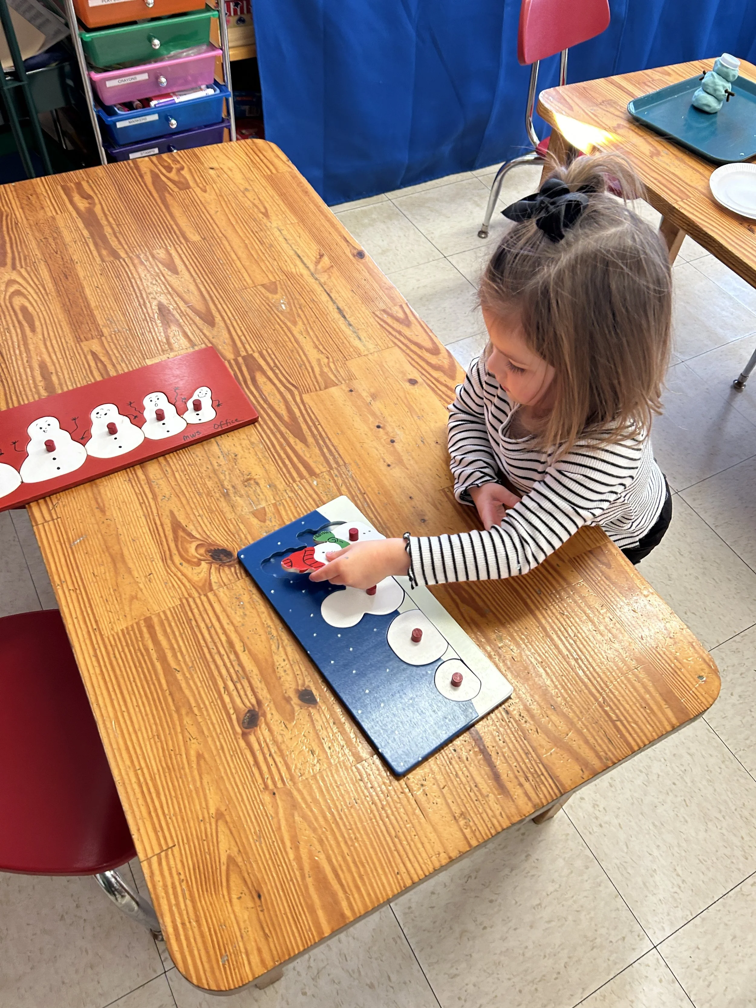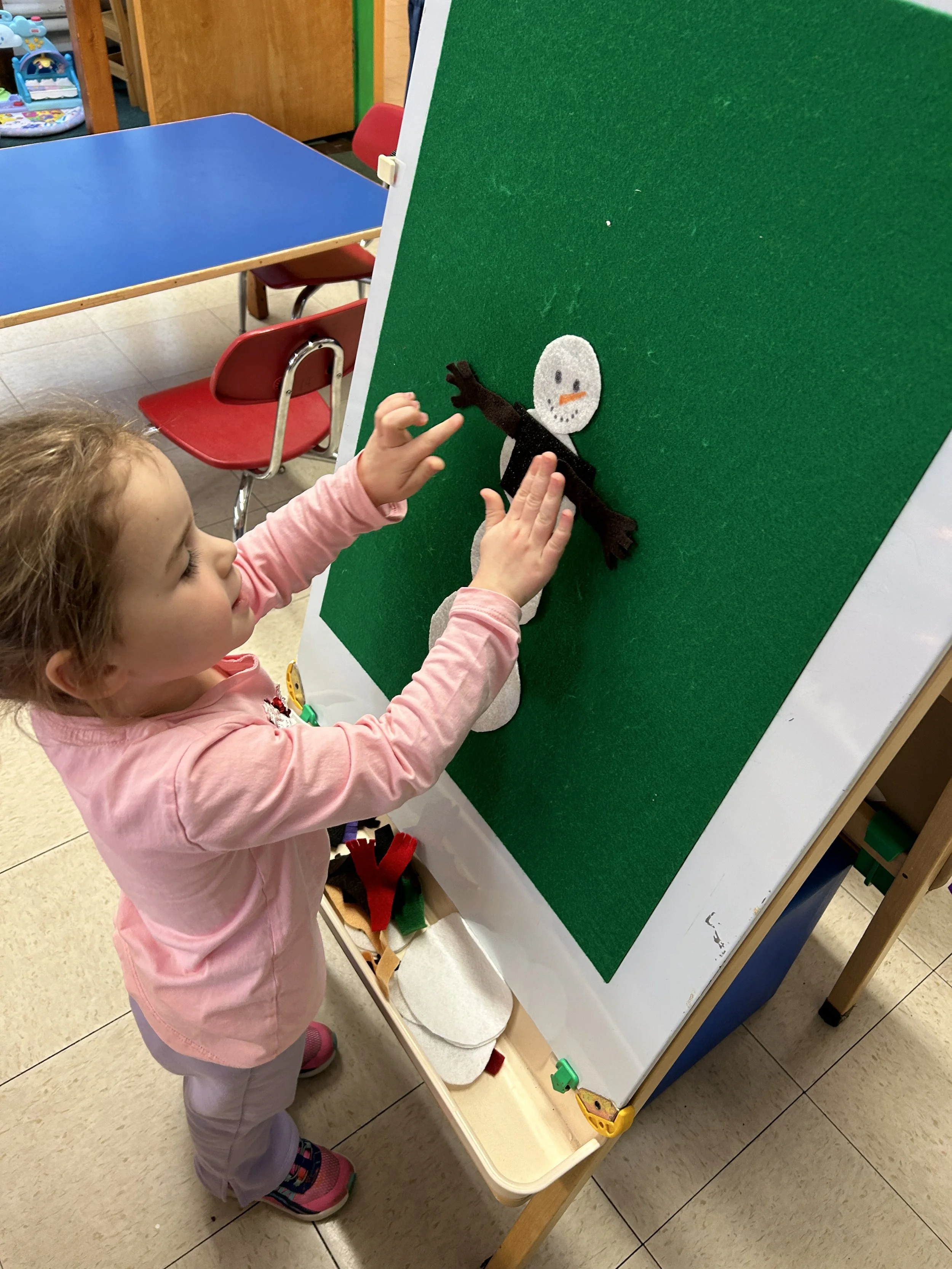 They also built felt snowmen at the easel. During circle time, we both sang and read “Frosty the Snowman.” We also read a story about a melting snowman, then sang “I’m a little snowman” where we melted just like the one in the story.