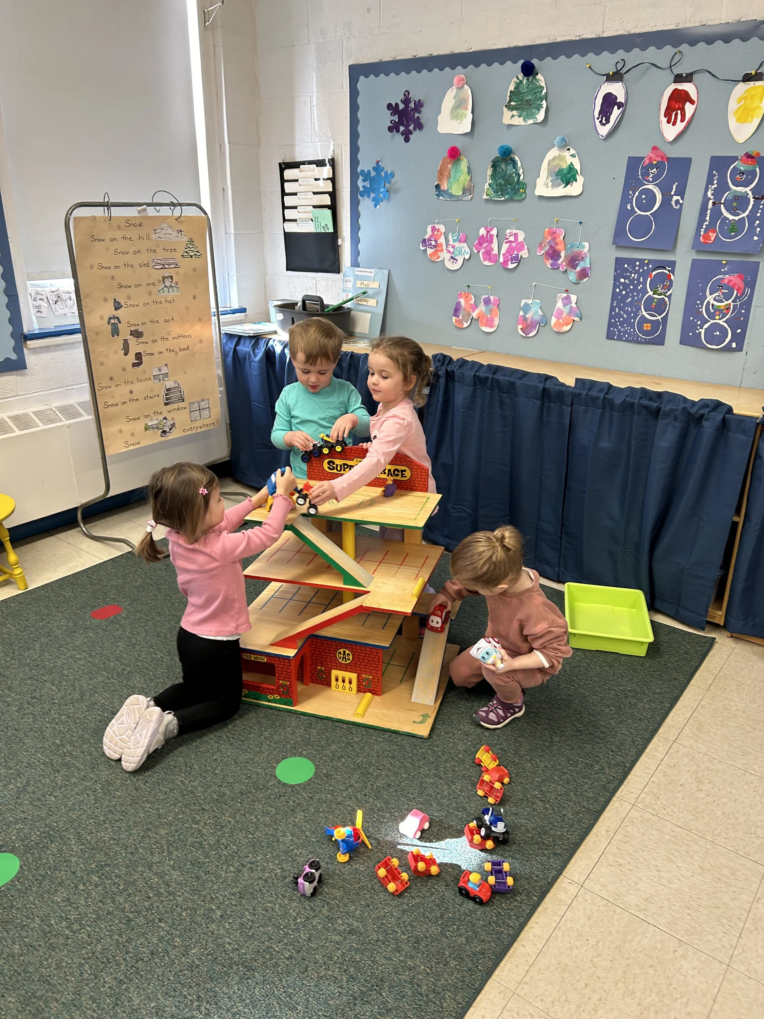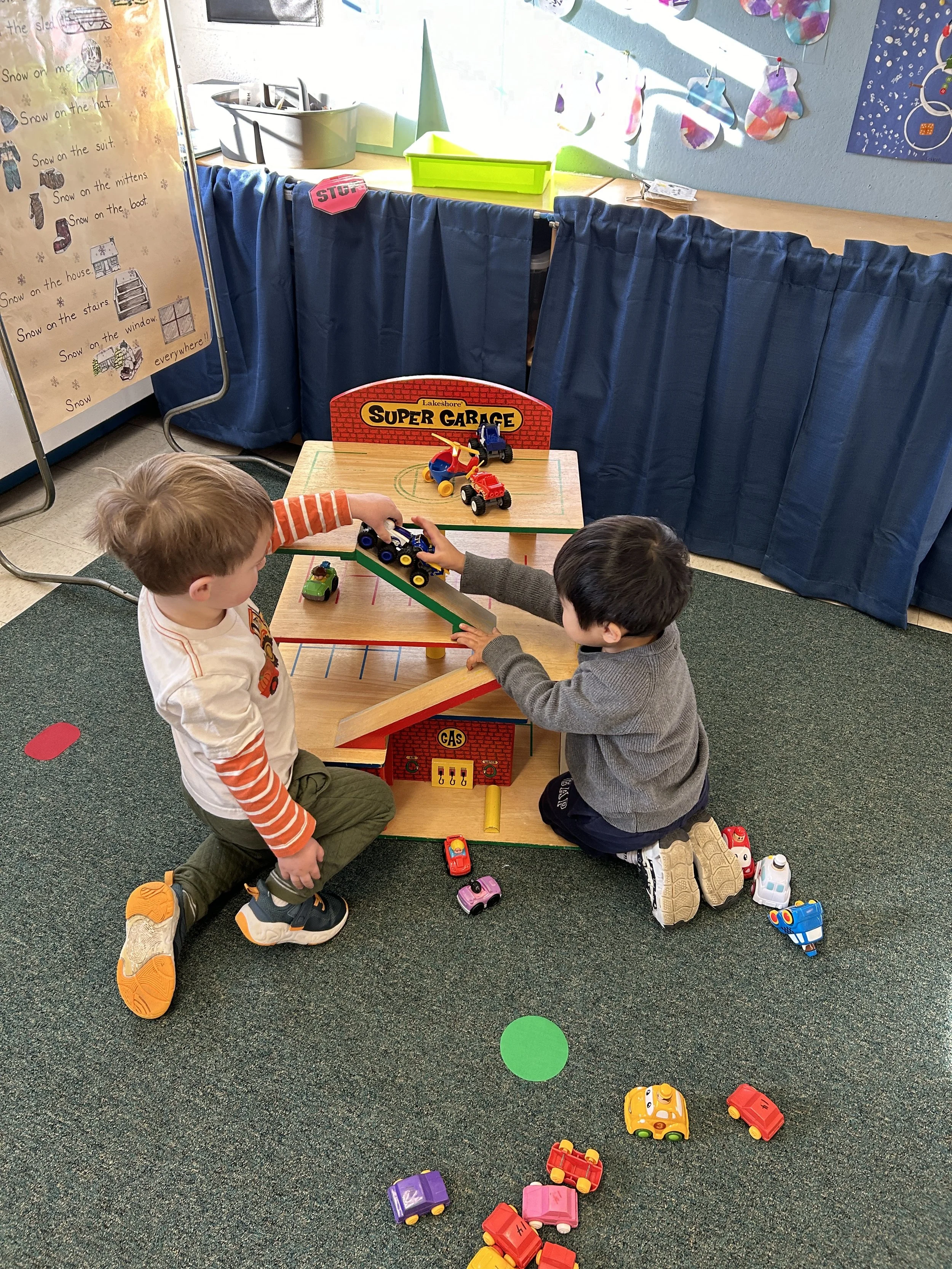 On the rug, the children played with a large wooden garage with various cars.