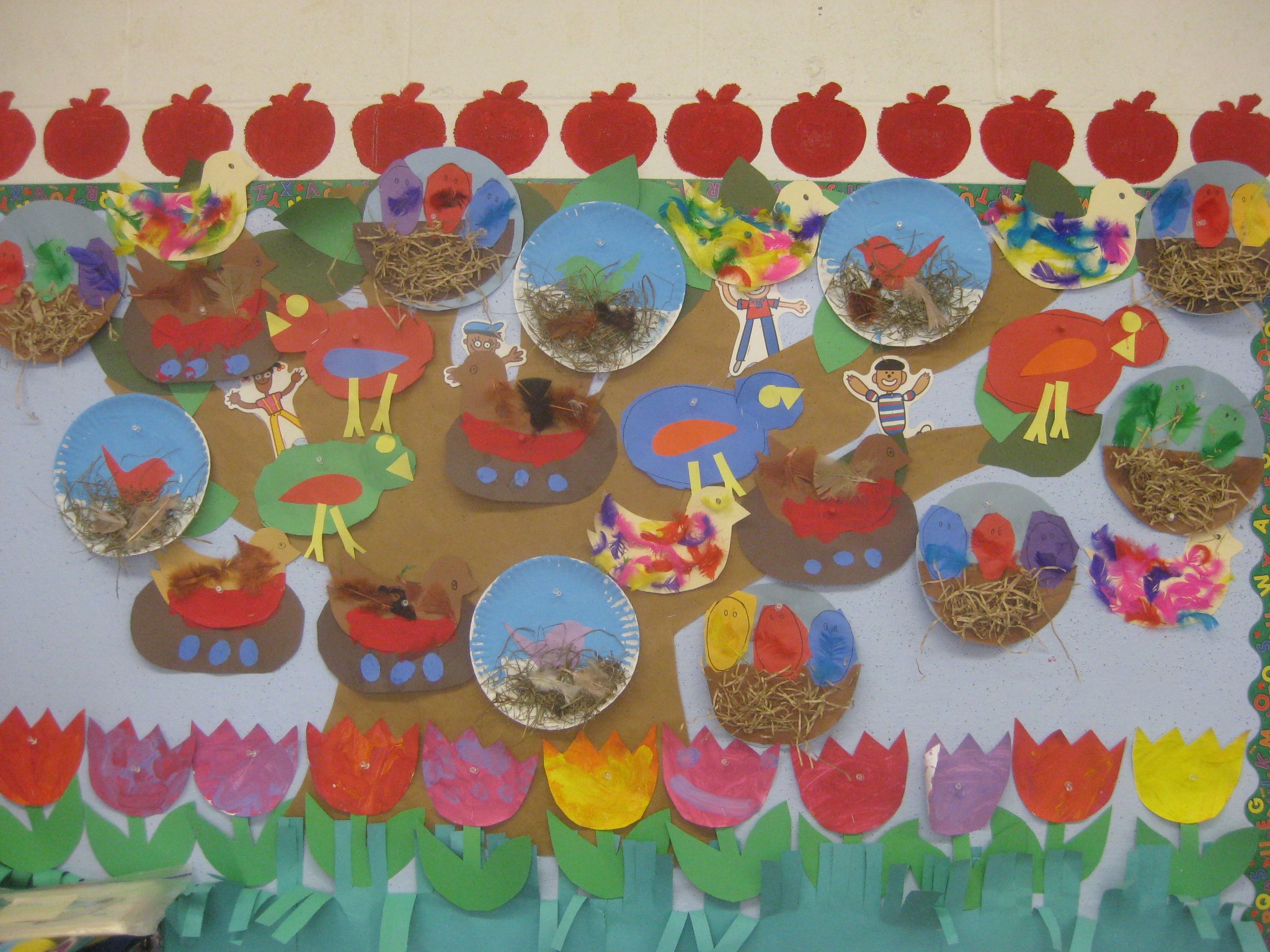 The tree on our bulletin board is filled with all kinds of birds and nests. Some of these projects required the children to use scissors, and they worked very hard to cut the shapes.