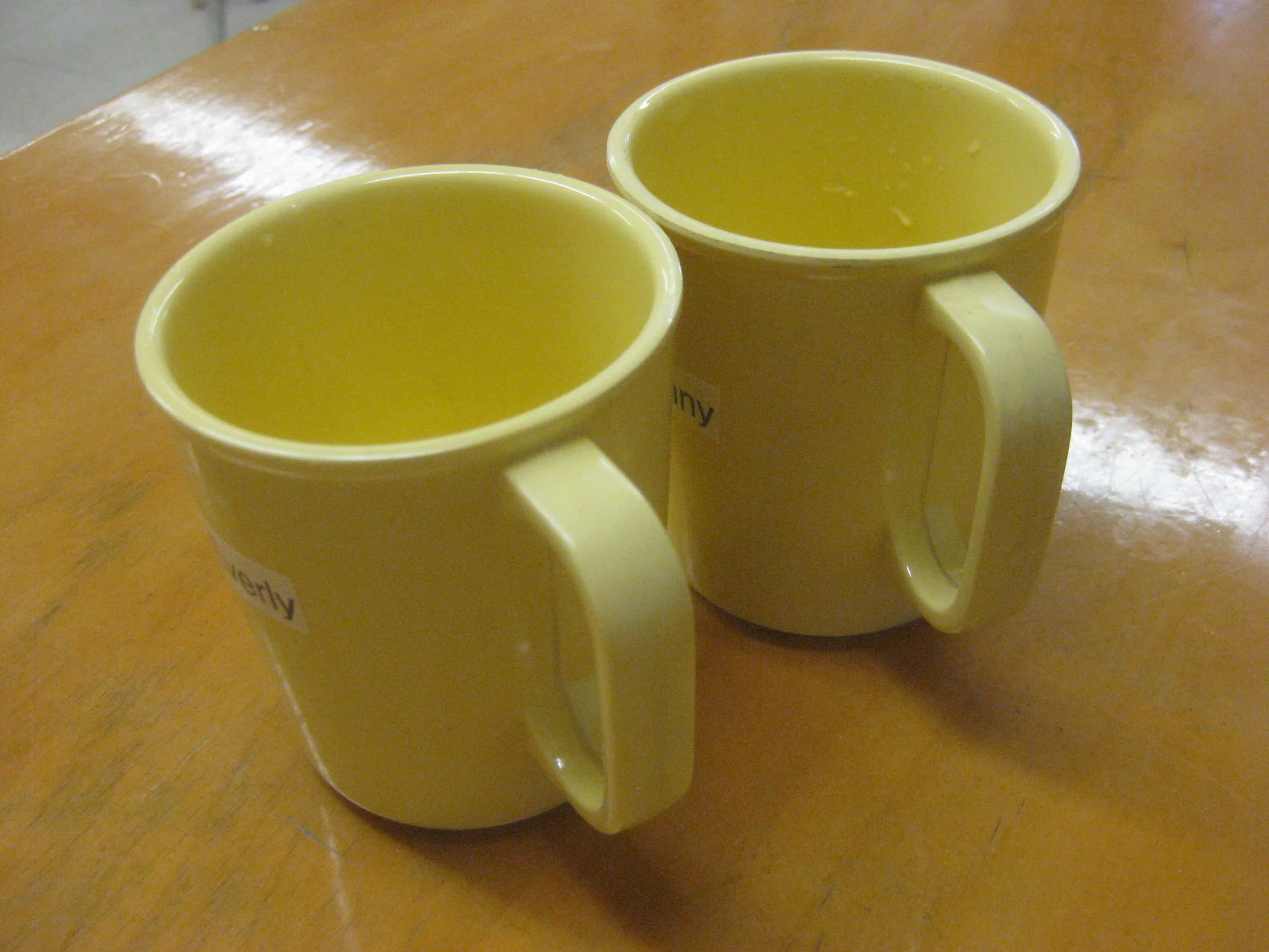Do you ever wonder what kind of cups the children use at snack time? They use plastic mugs with one handle that have their names. These are washed and put thru the dishwasher/sanitizer machine daily. Because we are a preschool class, it is expected that there will be some spills with the open cups, but mastering the use of an open cup is one of the many skills the children learn. Most of the children bring water bottles in their school bags or lunches and we use those when the children ask for a drink outside of snack time. We always have some paper cups if there is no water bottle available.