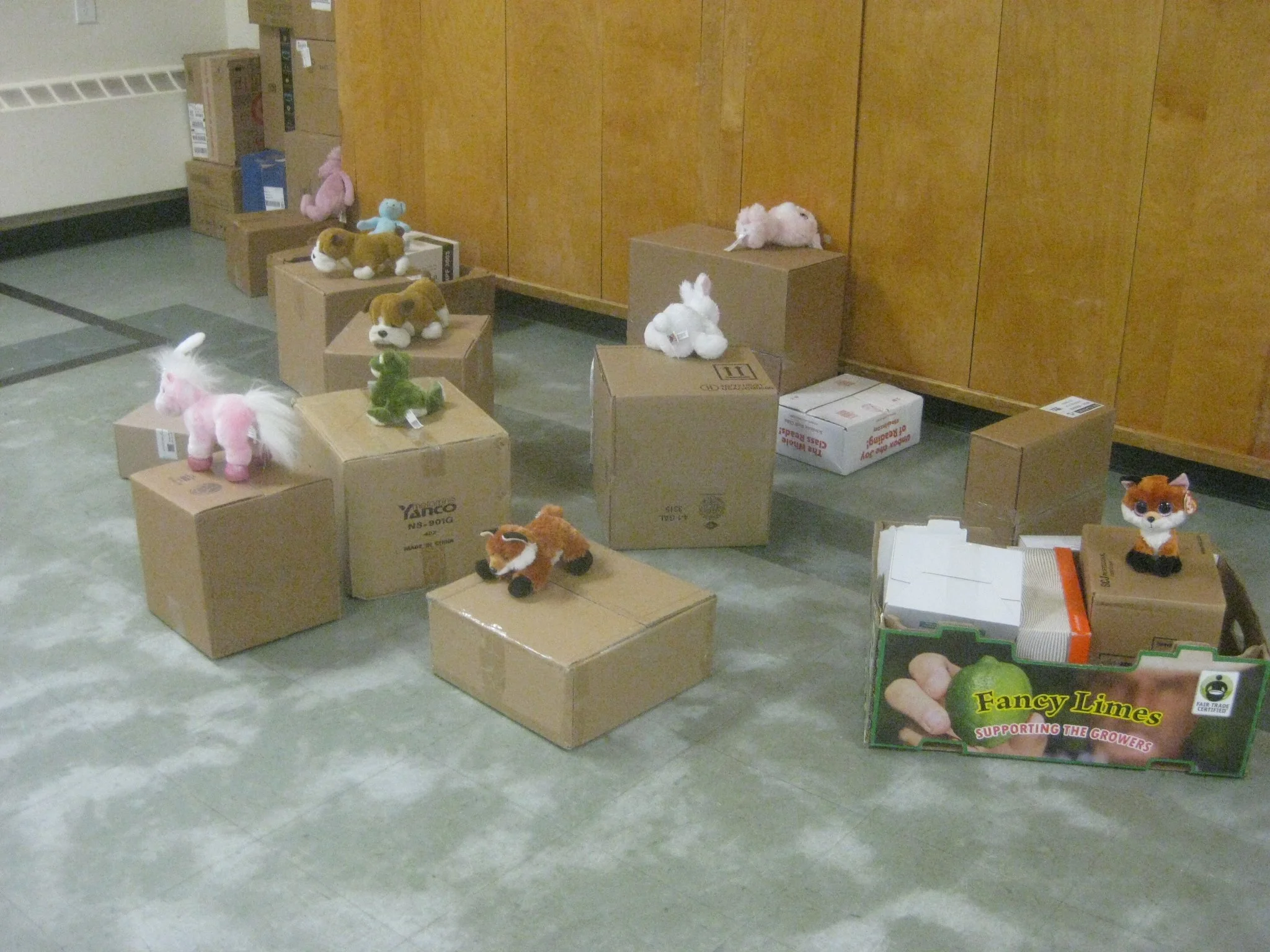 Our Big Room has many pieces of equipment to rotate each week, keeping the Big Room interesting. Kathy Reiss is always finding new ways to use the equipment or new things to put in the room. This week, there were many cardboard boxes with which to play. One day they were out with long, heavy weight, cardboard tubes and small plastic trucks. It was interesting to watch the children build with the boxes, small groups cooperatively played with some holding the tubes in place while others put the trucks down the tubes. In fact, the first day the children spent our entire Big Room time in this box corner. Another day, the trucks were replaced with small balls. And later in the week, the tubes and balls were replaced by stuffed animals. Something as simple as cardboard boxes generated a lot of play.