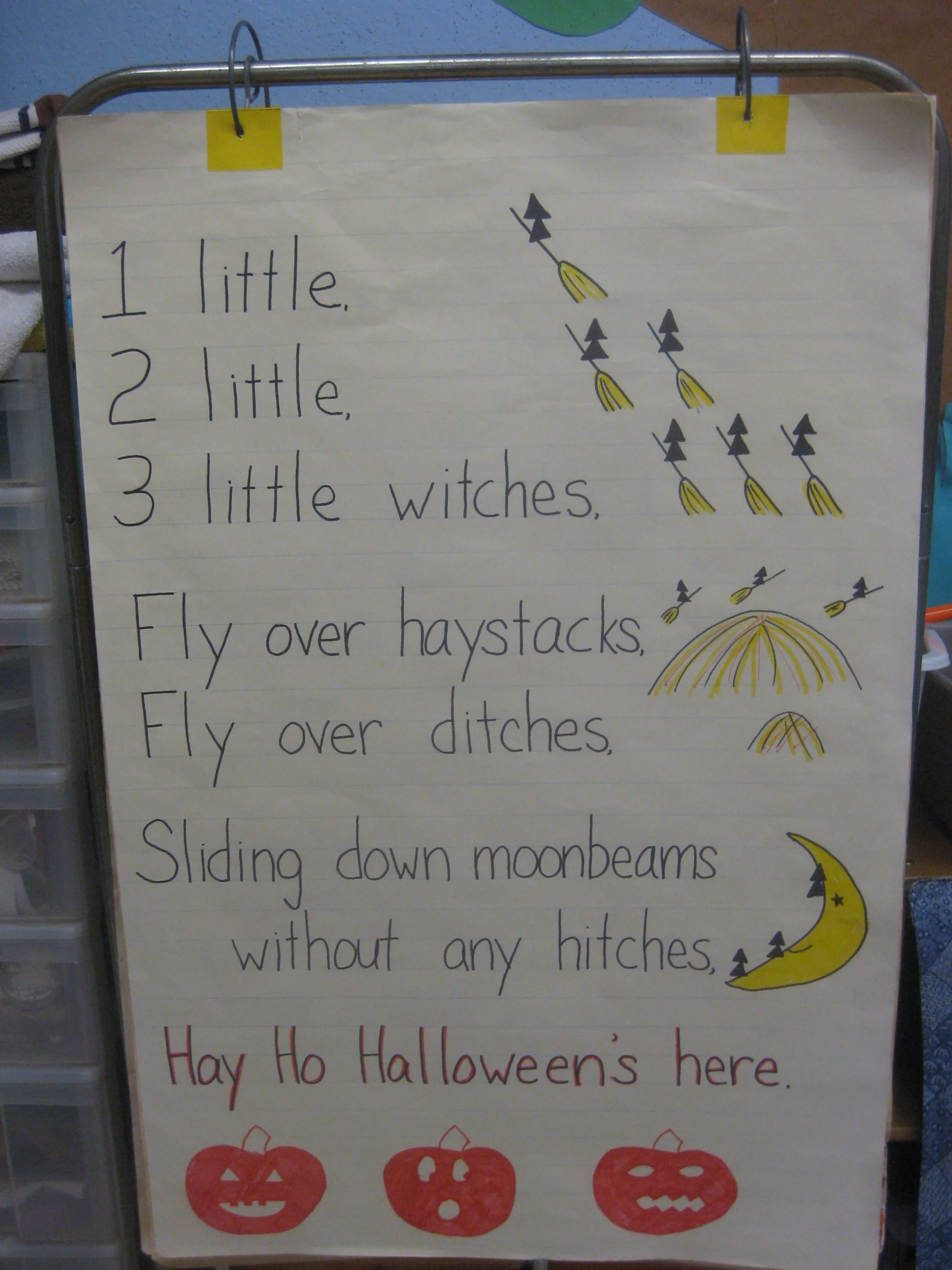 On Monday we were still singing a Halloween song that seemed to have gotten inside the children’s heads. All during the morning, someone would be playing and start singing this song, with other nearby children joining in. In case your child was singing this at home, here are all the words.