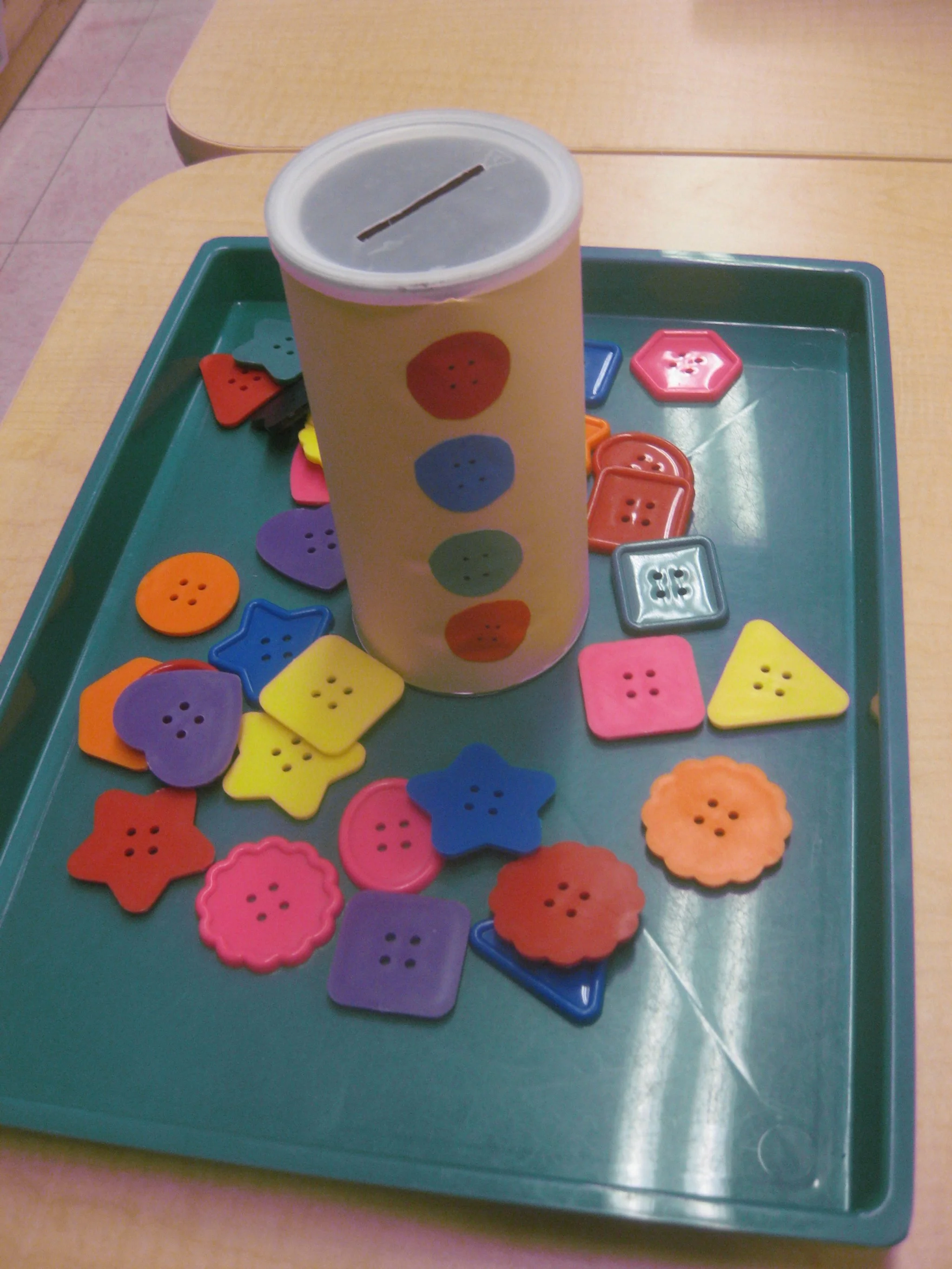 It’s impossible to know which items will be very popular with the children. You may think it may be an expensive, fancy toy. This week I took a tall can and covered it with yellow paper. I attached 4 paper buttons and made a slit in the lid. It was put on a tray with many ‘play’ buttons. This proved to be so popular that often one of the teachers had to sit at the table to ensure that everyone got a turn and any battles could be squashed over who got to put the buttons in the slit. The simplest of a homemade toy was the most popular