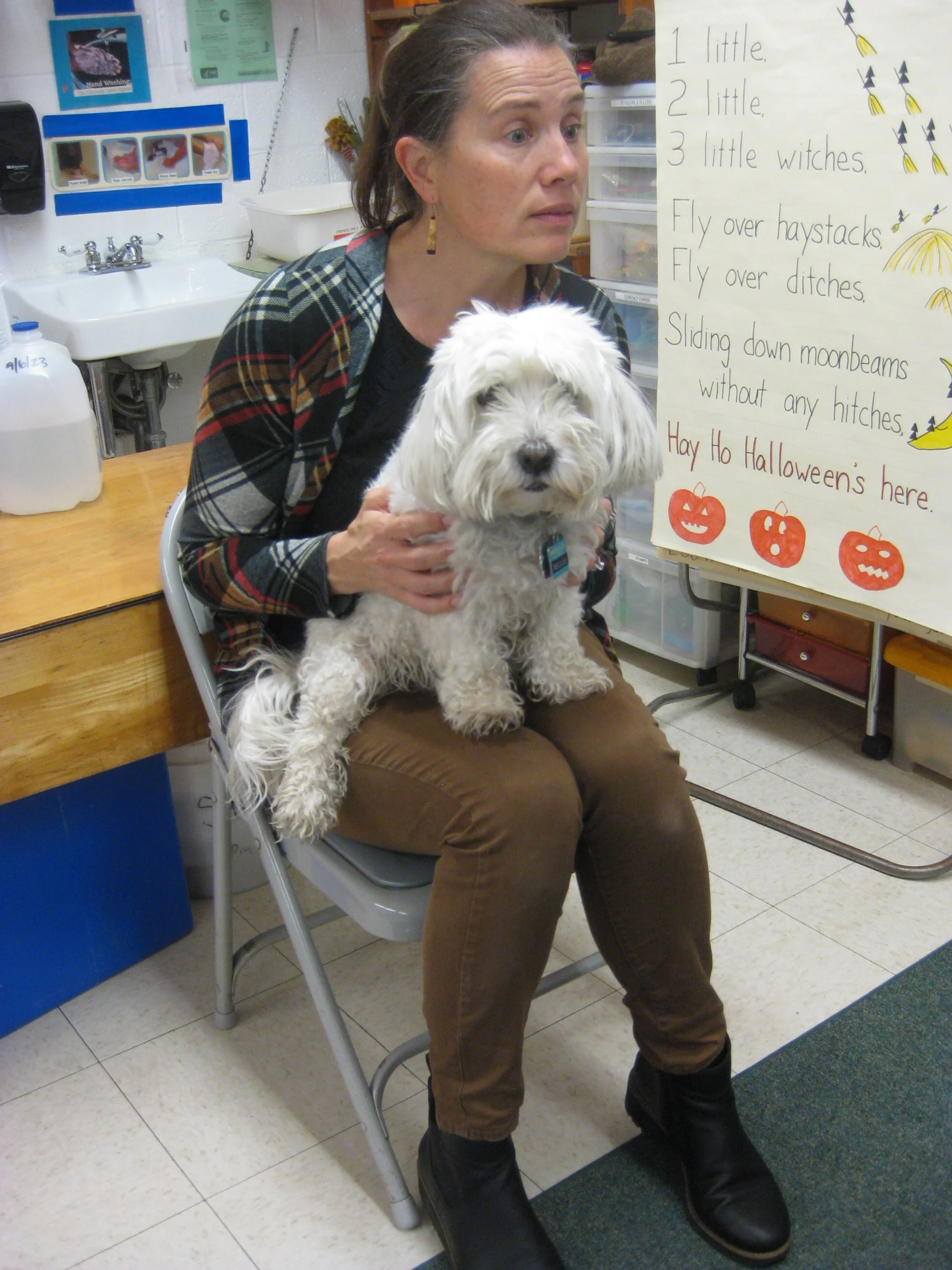 A special visitor came to visit our class this week. Reggie, Mrs. Reiss’s dog was at school waiting for the mobile grooming van to give him some spa treatment. We always enjoy his visits. He is very calm, sits on Mrs. Reiss’s lap and allows pats from any of the children who choose to. The children were able to come up one at a time and give him a gentle pat. The spa treatment was very successful - he is very white again with a beautiful haircut.