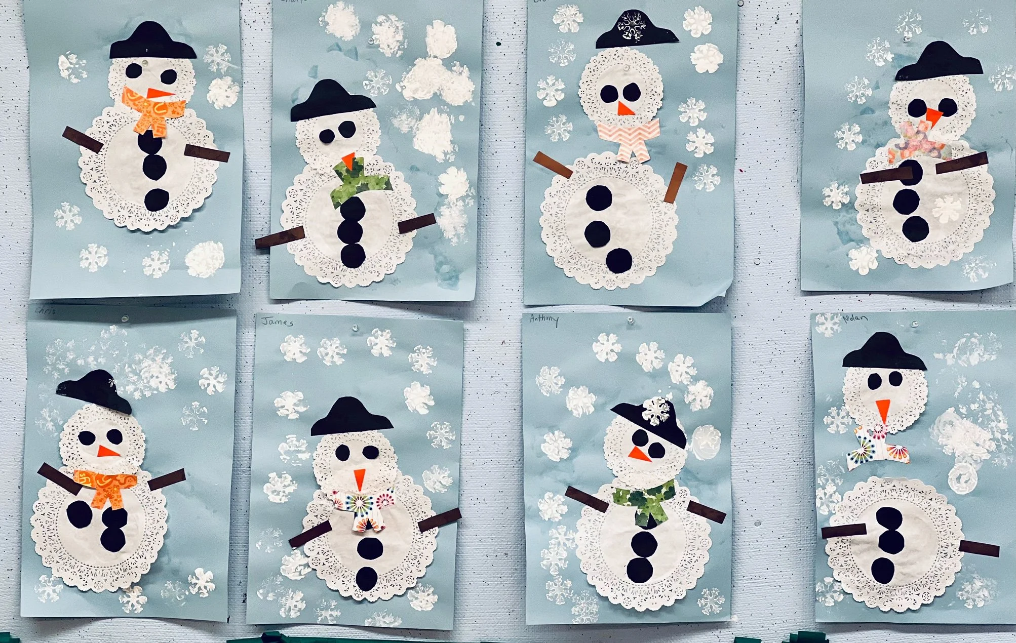 This week our small but mighty class grew and became a medium and mighty class. We are still missing some of our classmates, but our numbers are getting closer to our full enrollment. In preparation for tomorrow’s storm, we made snowmen and snowy scenes at our art table this week. Our bulletin boards celebrate our weather.