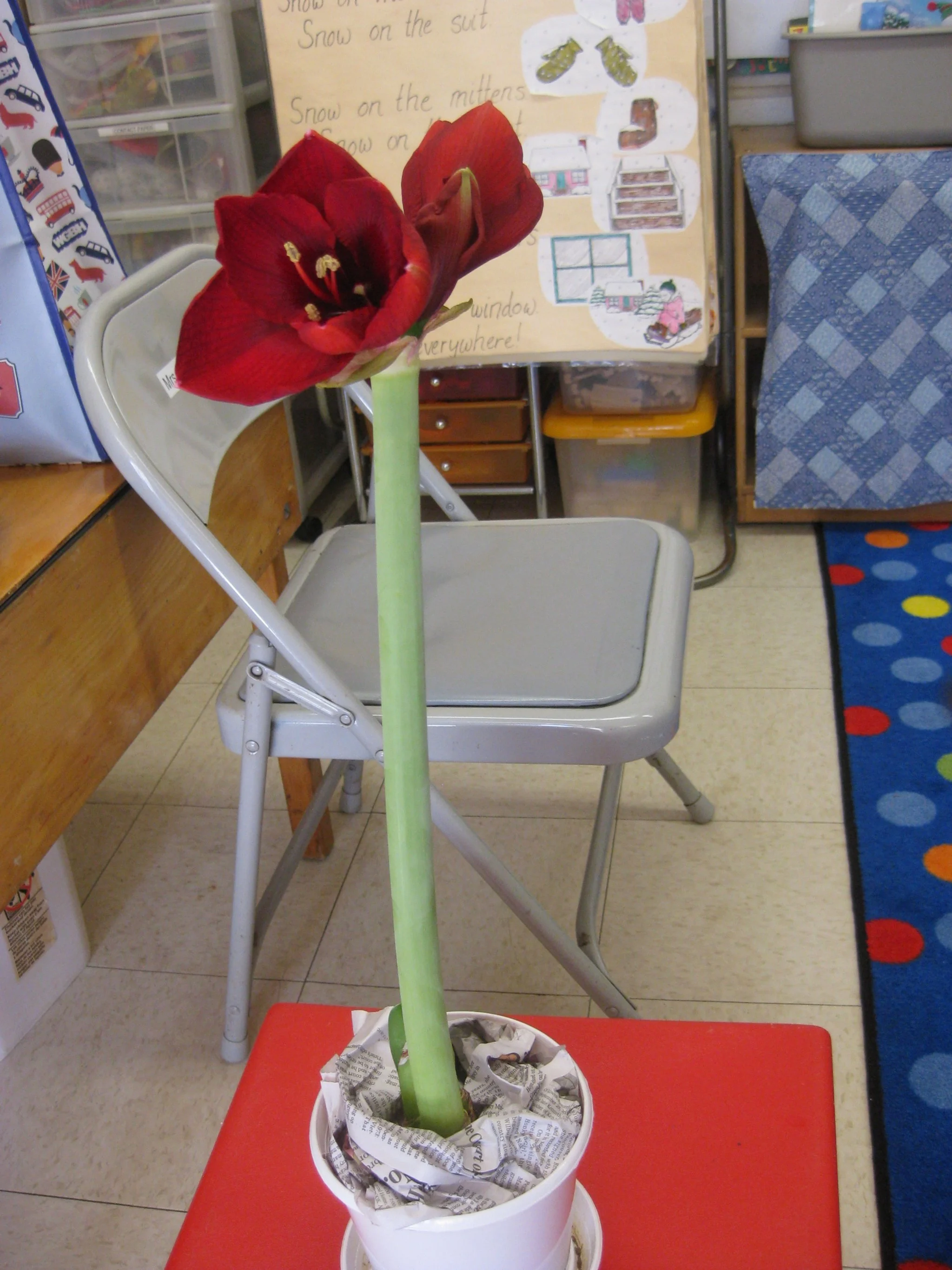 Our amaryllis plant is blooming! We were all excited to come to school today and see the red flowers are opening up. There will be 3 flowers when all are opened. Stay tuned…….