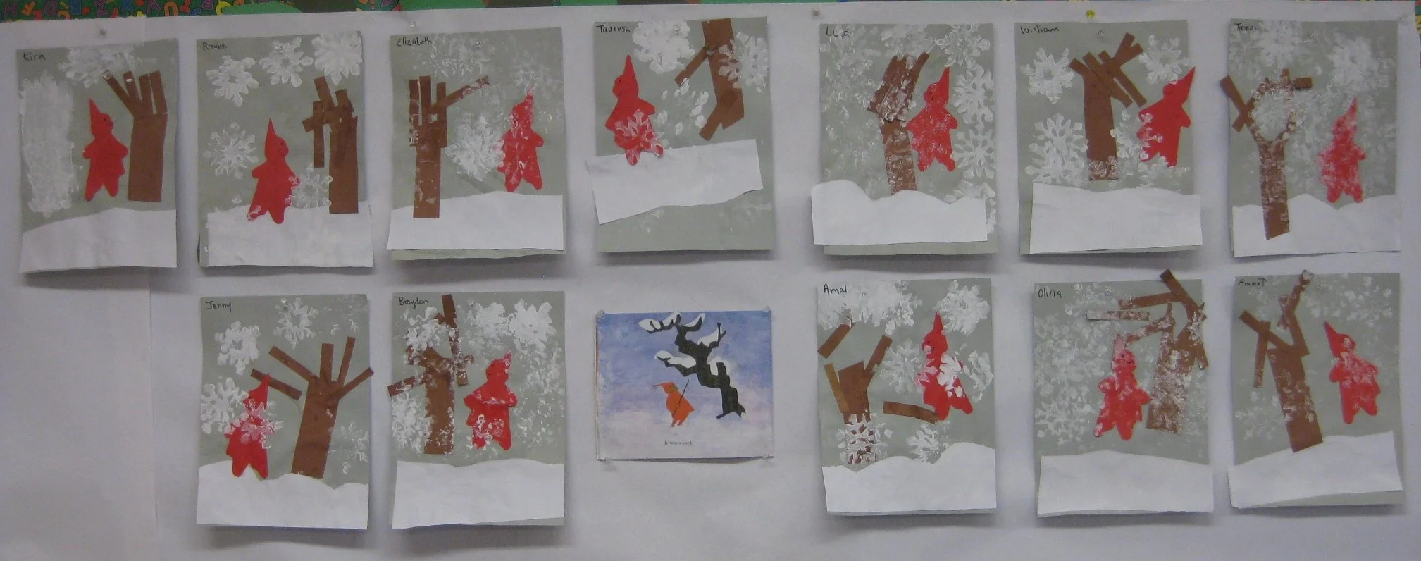 On Tuesday and Wednesday, we read a book called “The Snowy Day” by Ezra Jack Keats. On Wednesday, we made a project based on the story. The children had a sample of the project and also the page from the book that we were recreating. The page from the book is displayed on the bulletin board, and you are able to see one way to take an artist’s picture and interpret it for preschool. After talking about the story and its character often, the children felt connected to Peter, the boy in the red snowsuit.