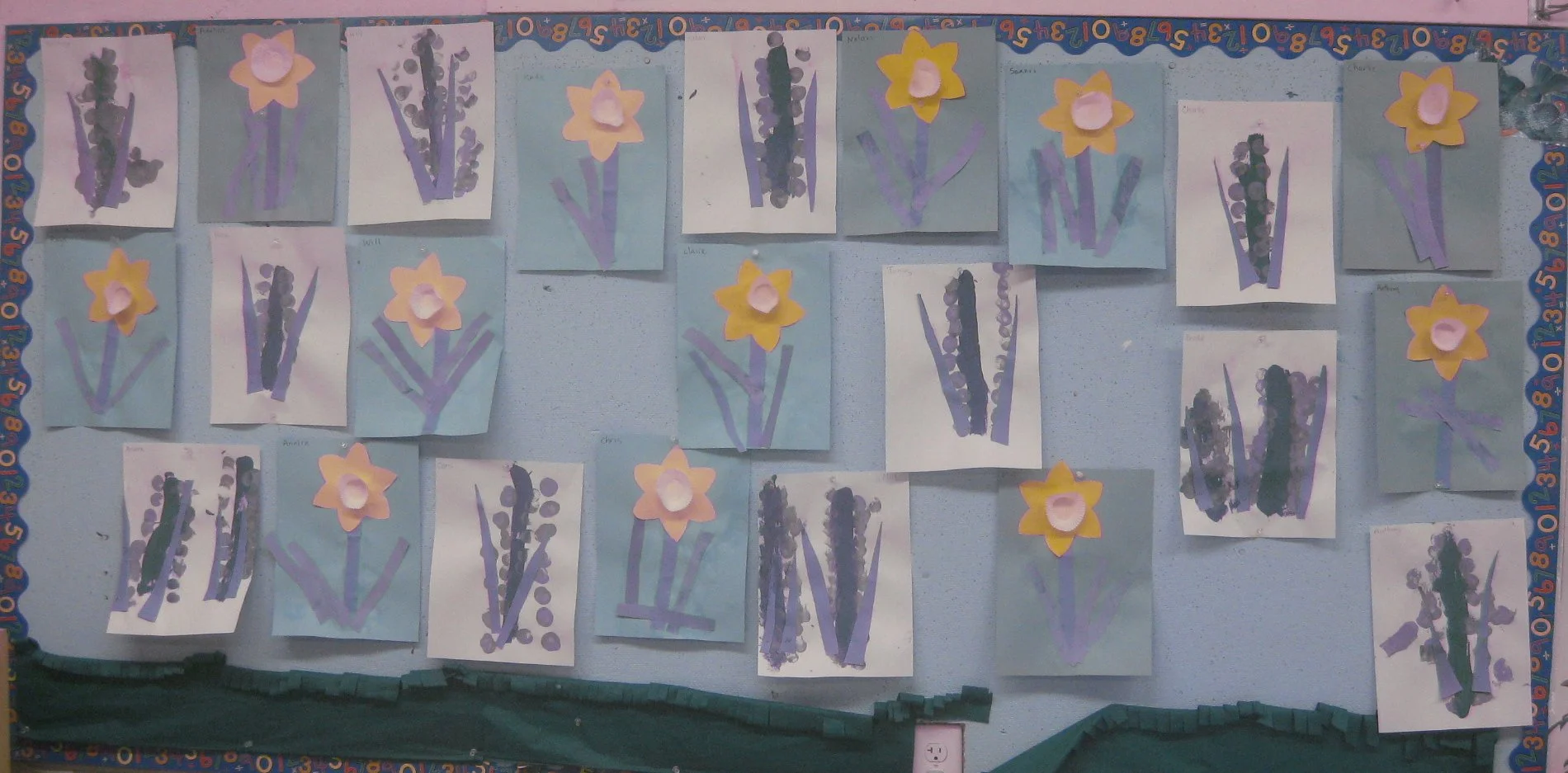 Our classroom is adorned by spring flowers to welcome the season. The children made daffodils and hyacinths along with umbrellas which always are needed this time of year. Our bulletin board has vibrant yellow, purple, and green, but the settings on my camera are washing out the color as you can see in the photo. It seems to be an accepted theory that people of my generation are not very technologically savvy but their children are. My children will be visiting during this vacation and hopefully one of them will figure out what is wrong with the settings on my camera. (In the middle of the previous sentence my connection stopped. I thought I was doing well when I changed the batteries on my trackpad only to discover that it was the keyboard that needed new batteries. I guess my children’s assessment of my tech skills is warranted.)