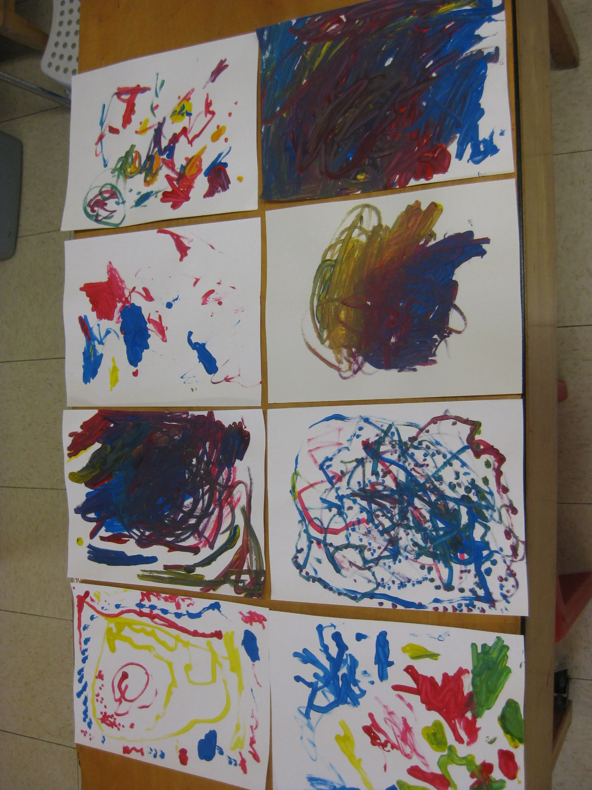 This week the children made projects with the three primary colors, red, yellow, and blue. They used sticky contact paper with colored pieces, foam stickers, large paintbrushes at the easel, and small cotton swabs, which are shown here. Each child approaches their project in their own way. Some kept the colors separate, some covered large areas with paint, some drew lines and added dots, some did color mixing. Each one is beautiful.