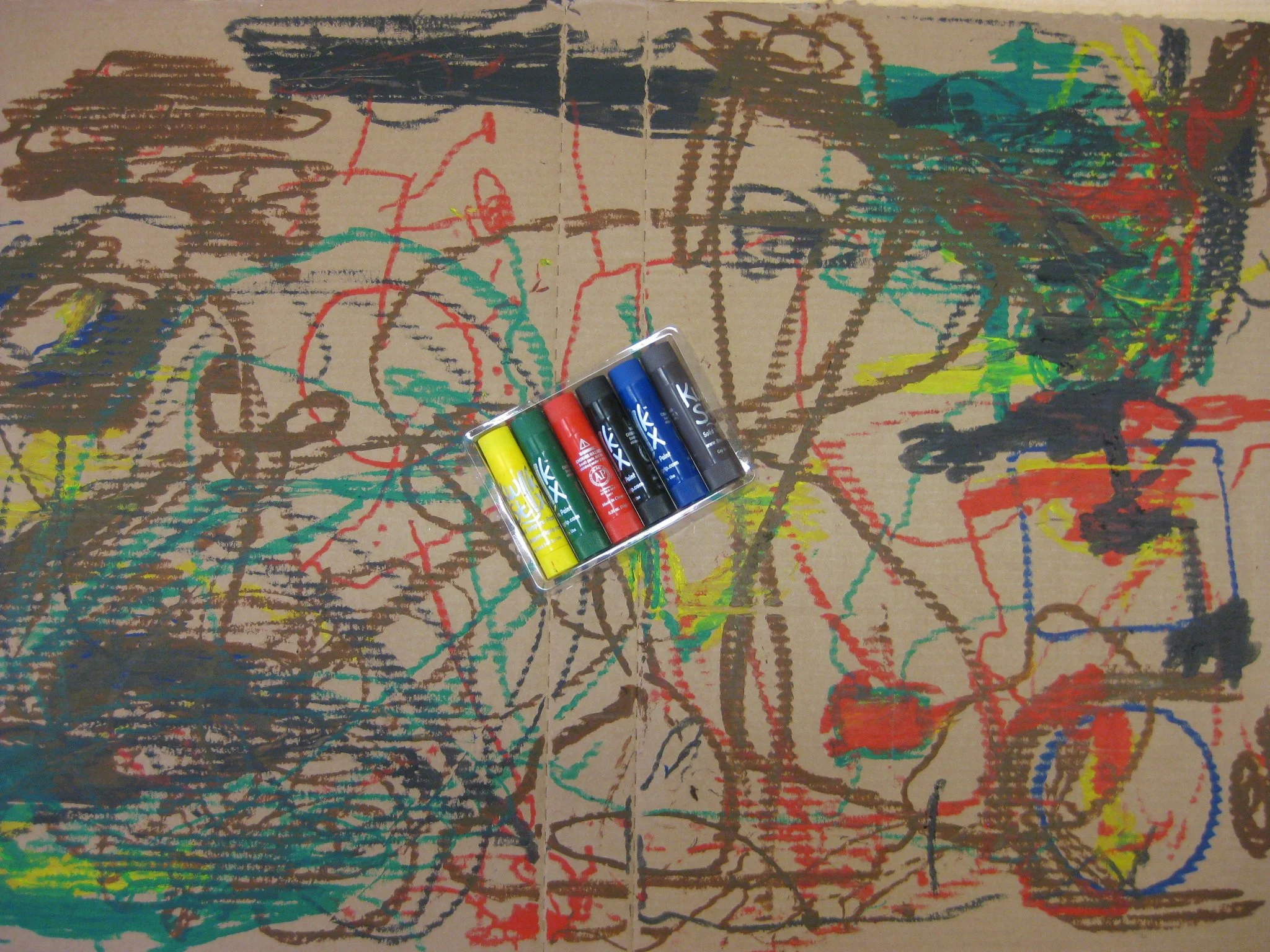 On Fridays, our class consists of the three children who attend MWS Monday - Friday. Eventually, as our class grows, we will have more children on Friday. We may be small, but we are mighty. The only other class in session is Mrs. Chen’s preK class. We have found that it works out great for our two classes to combine in the Big Room and the Playground. Today, there was a large piece of cardboard that had been used for shipping. Preschool teachers are always finding ways to use items that others think of as trash. Our three boys enjoyed covering the cardboard below with these solid tempera paint sticks.