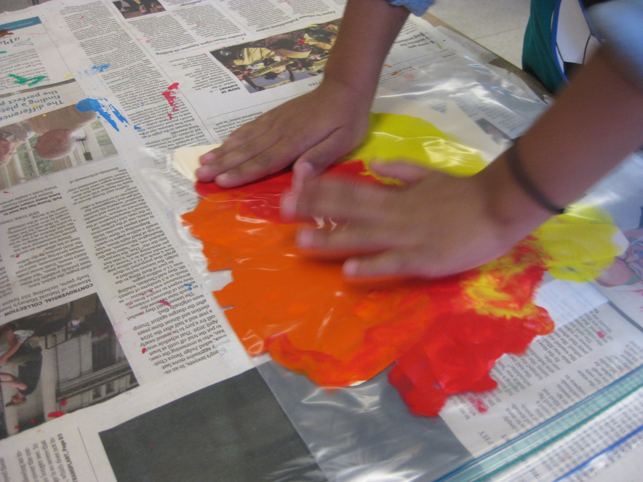The children made beautiful fall leaves which are on our bulletin board. One of the methods involved pushing paint around in a zip lock bag. The leaf shape was in the bag along with 3 colors of paint. This took a lot of strength and hand manipulation to cover the entire leaf. And it was a joy to paint a leaf and have clean hands at the end.