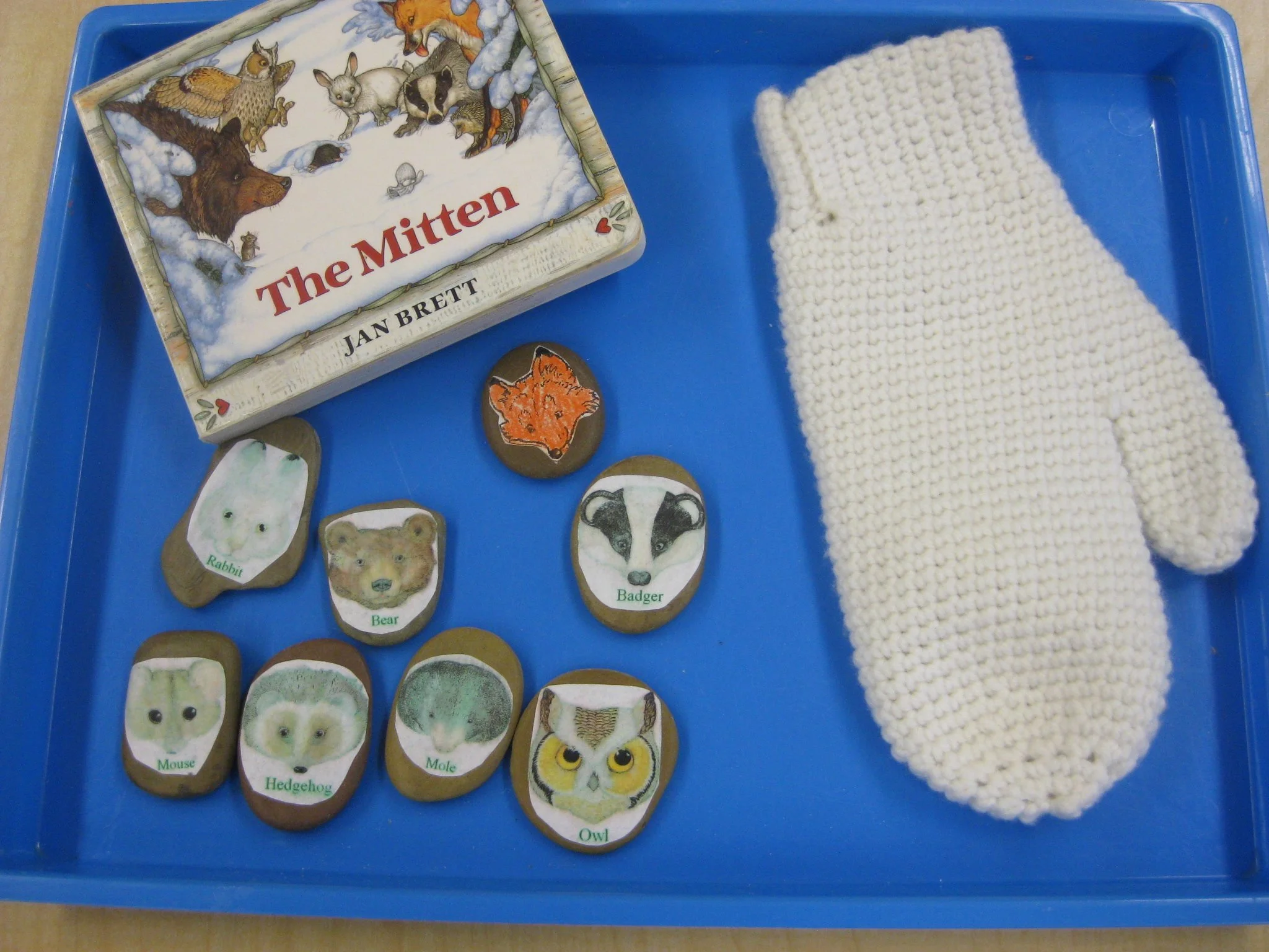 Are you familiar with the classic Jan Brett story The Mitten? The children heard the story both Monday and Tuesday and made a project with all of the animals. I introduced the mitten you see in the photo with the animal rocks and showed them how tell the story using these props. It was so popular an activity that children were playing with it Tuesday through Friday. We also acted out the story with the children taking turns holding a large printed picture of the animals or holding the mitten (a white tablecloth). As we sang a retelling of the story, the children holding the pictures went ‘into’ the mitten. This was also very popular.