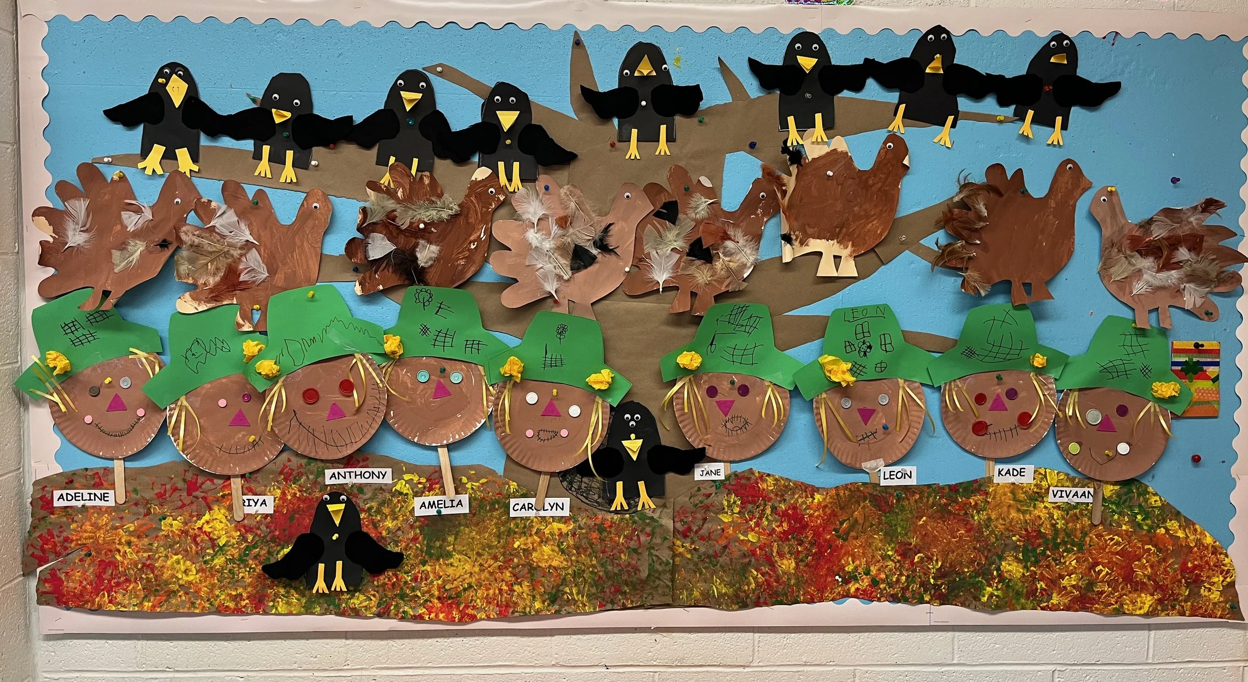 All month long we have been adding to our classroom tree. The apples and leaves came down, and they were replaced by crows, scarecrows and turkeys. It was very exciting when one day we saw a real turkey walking in the yard outside our classroom. Unfortunately, I was unable to get a picture!