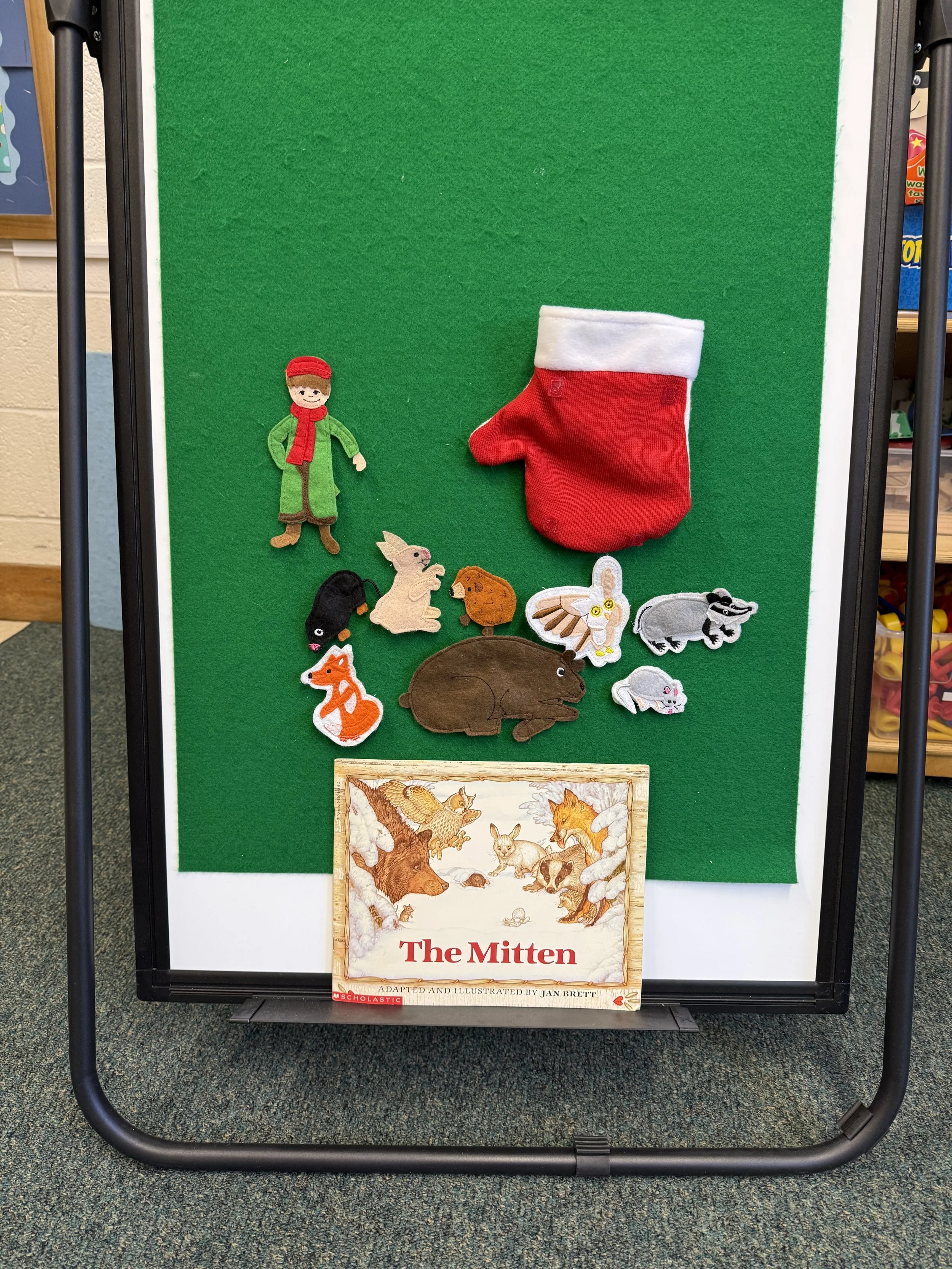 We also read the story The Mitten by Jan Brett. After we read this story, we acted it out using the animals and this mitten. The children loved this story so much and were easily able to retell each animal that moved next into the mitten. We acted this out multiple times!