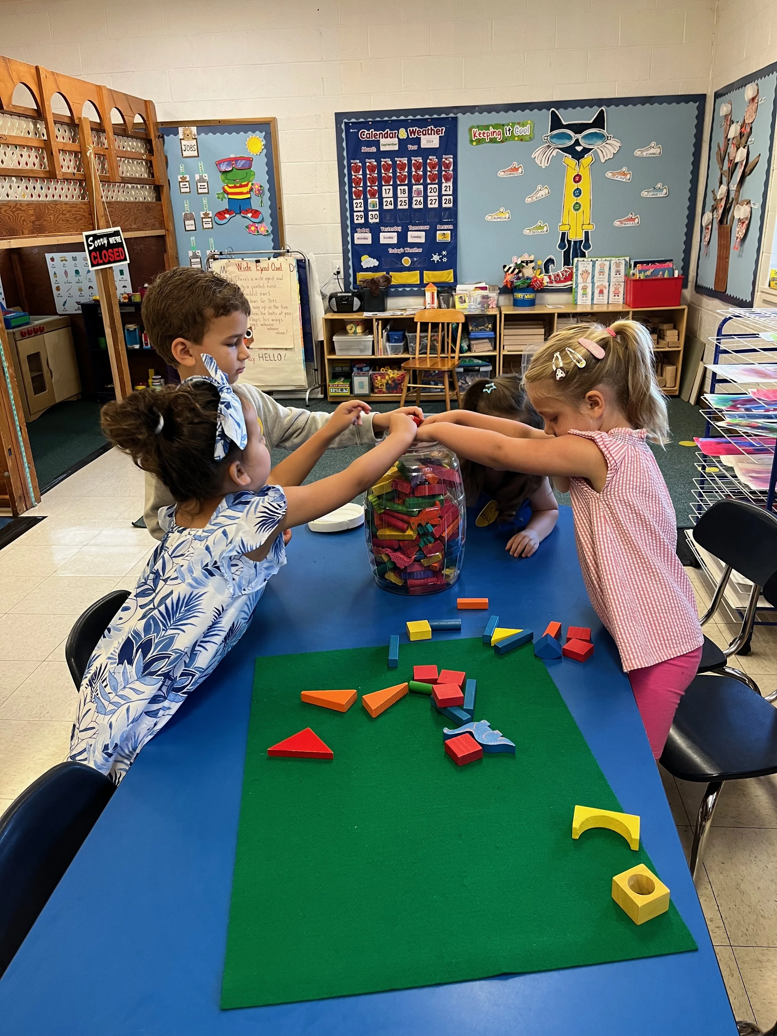 At the beginning of the year we spend a lot of time talking about routines and responsibilities. One of those responsibilities is cleaning up after playtime. Your children are already excellent listeners and eager to help clean up. I love this picture because it demonstrates what great helpers they are. I asked for one person to clean up the blocks on the table and four of them rushed over to assist. Taking care of our classroom and helping each other are important ways that we build community.